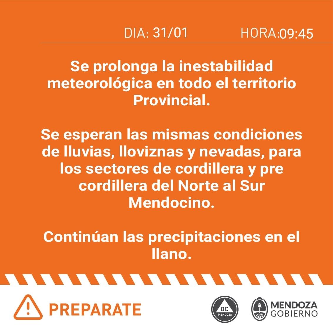 "Se prolonga la inestabilidad meteorológica en todo el territorio provincial", indica el alerta, y agrega: "Se esperan las mismas condiciones de lluvias, lloviznas y nevadas para los sectores de cordillera y pre cordillera del norte al sur mendocino".