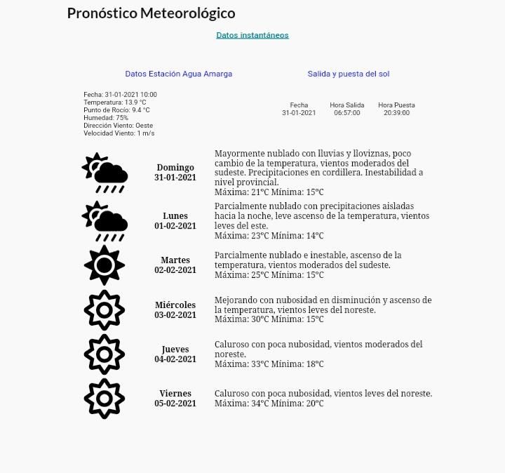 El pronóstico de la Dirección de Agricultura y Contingencias Climáticas indica que para hoy se espera que esté "mayormente nublado con lluvias y lloviznas, poco cambio de la temperatura y vientos moderados del sudeste". Además, agrega que "habrá precipitaciones en cordillera e inestabilidad a nivel provincial". La mínima será de 14°C mientras que la máxima será de 21°C.