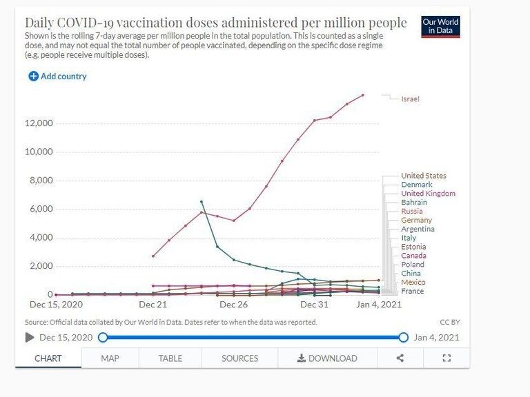 El listado se encuentra, al día lunes 4 de enero, encabezado por Israel. Le siguen Estados Unidos, Dinamarca, Reino Unido, Baréin, Rusia, Alemania, Argentina, Italia, Estonia, Canadá, Polonia, China, México y Francia.