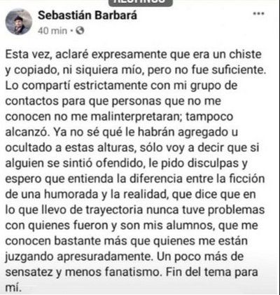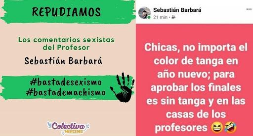 A través de su cuenta de Facebook, el profesor de Lengua y Literatura Sebastián Barbará había publicado: “Chicas no importa el color de la tanga para año nuevo, para aprobar los finales es sin tanga y en la casa de los profesores”. Finalmente, el docente decidió cerrar ayer su cuenta de Facebook.