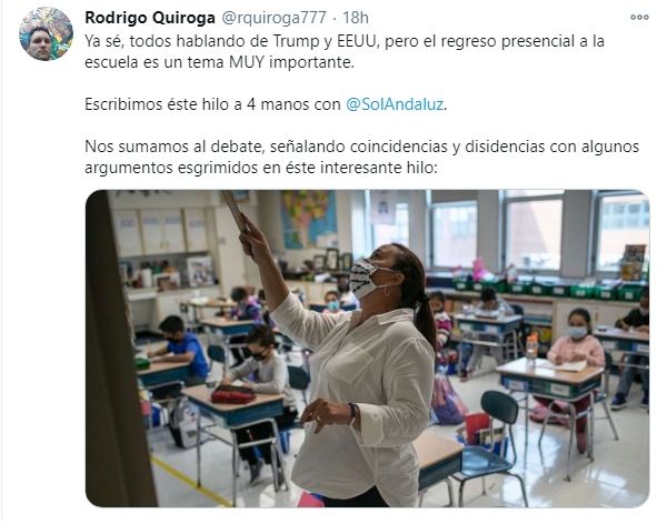 6. Respecto al impacto económico y productivo, Quiroga recordó a sus seguidores que si bien el cierre de colegios tiene sus consecuencias, "aumentar la transmisión comunitaria tiene impactos mucho mayores si obliga a otro tipo de restricciones debido a la saturación de la capacidad del sistema de salud".