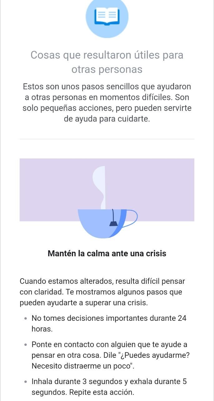 Para quienes descartan la opción de contactar a un conocido o recibir asistencia de un voluntario, la app ofrece consejos de bienestar que funcionaron a otras personas. "Estos son unos pasos sencillos que ayudaron a otras personas en momentos difíciles. Son solo pequeñas acciones, pero pueden servirte de ayuda para cuidarte", dice la presentación.