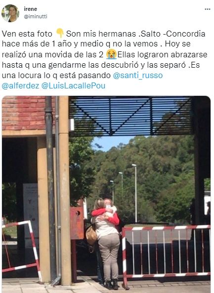 El absurdo de la restricción quedó evidenciado el último sábado cuando, durante una manifestación de ciudadanos de ambos países dos hermanas decidieron darse un abrazo después de más de un año y medio sin verse. "Son mis hermanas .Salto -Concordia hace más de 1 año y medio q no la vemos . Hoy se realizó una movida de las 2. Ellas lograron abrazarse hasta q una gendarme las descubrió y las separó. Es una locura lo q está pasando", escribió Irene en sus redes.