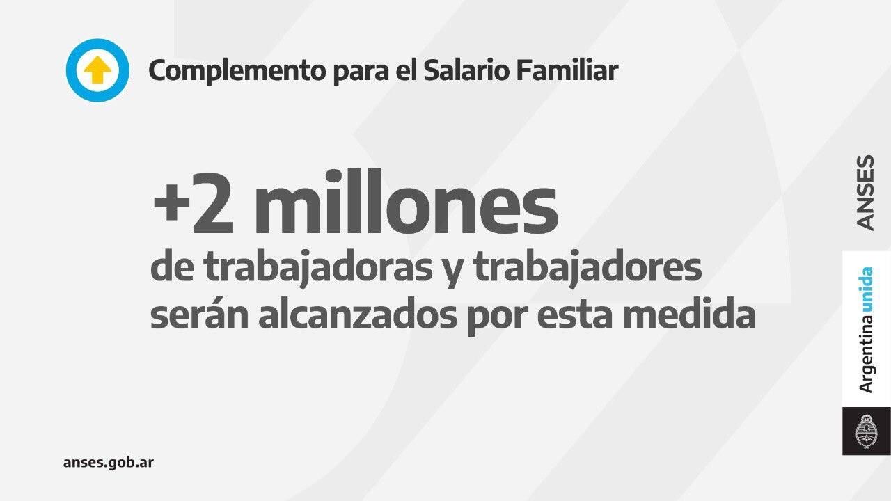 Afecta a más de 3 millones de niños, niñas y adolescentes e impactará en los haberes de más de 2 millones de trabajadores. El beneficio es que se duplica la asignación familiar básica con un Complemento Mensual para el Salario Familiar. Hoy Anses confirmó que el pago comenzará a hacerse efectivo a partir del lunes 25 de octubre.