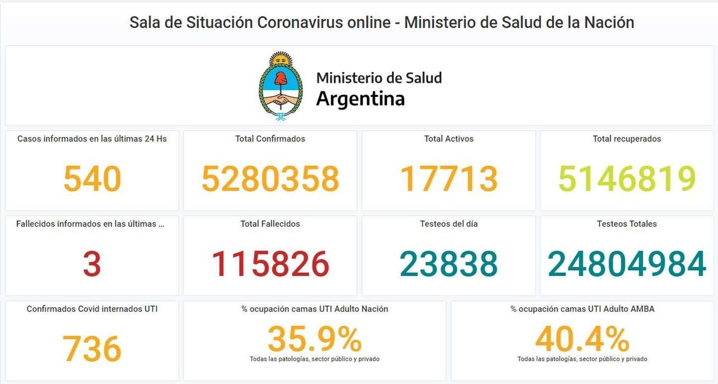 Otras tres personas murieron y 540 fueron reportadas con coronavirus en las últimas 24 horas en la Argentina, con lo que suman 115.826 los fallecidos registrados oficialmente a nivel nacional y 5.280.358 los contagiados desde el inicio de la pandemia, informó hoy el Ministerio de Salud.