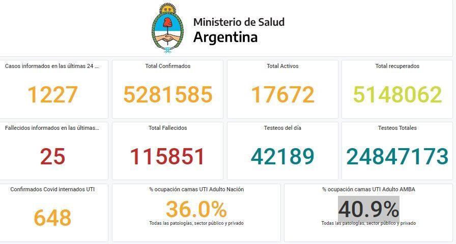 La cartera sanitaria indicó que son 648 los internados en unidades de terapia intensiva (UTI), con un porcentaje de ocupación de camas de adultos de 36.0% en el país y del 40.9% en la Área Metropolitana Buenos Aires (AMBA).