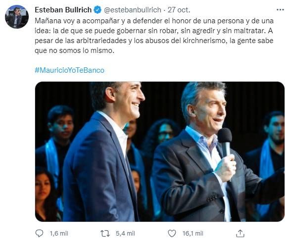 "Estoy bien de ánimo, me hicieron cirugía para poner un gastrostoma", anunció este viernes Esteban Bullrich. El miércoles había compartido en sus redes sociales un mensaje de apoyo al expresidente Mauricio Macri que debía ir a declarar a Dolores por la causa que investiga un supuesto espionaje ilegal a familiares de víctimas del submarino ARA San Juan, hundido en 2017.