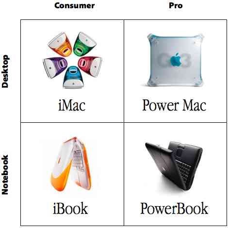 Cuando repasamos la historia de Apple podemos notar que a pesar de que desarrollaron una gran cantidad de productos diferentes, esta cantidad no está ni cerca de la variedad de productos que ofrecen y relucen otras empresas. Como dice el célebre refrán, el que mucho abarca poco aprieta. Steve Jobs siempre se caracterizó por abarcar poco y apretar muchísimo. En 1997 volvió a Apple en uno de los peores momentos del gigante tecnológico, el cual venía atravesando una enorme caída en las ventas. Parte del problema, identificado por el magnate fue la gran cantidad de oferta de productos diferentes que presentaba la empresa. Muchos de los cuales no estaban bien desarrollados ni terminados. El excéntrico empresario, tomó una medida drástica. Quito alrededor del 70% de los productos del mercado y se enfocó en mejorar a fondo el 30% restante. Este 30% consistió en solamente 4 productos. Enfocados a dos targets muy específicos y diferentes entre sí. El consumidor promedio y el consumidor profesional. Las computadoras imac, ibook, powerbook y Power Mac.
