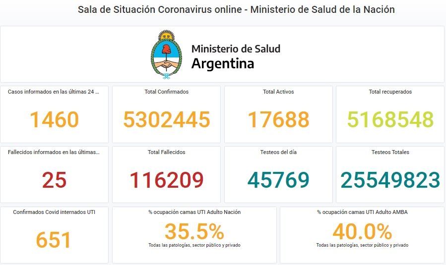 El Ministerio de Salud de la Nación informó este jueves 1.460 nuevos casos positivos de coronavirus y 25 muertes. Con estos datos, el total de contagios asciende a 5.302.445 y las víctimas fatales ya son 116.209.