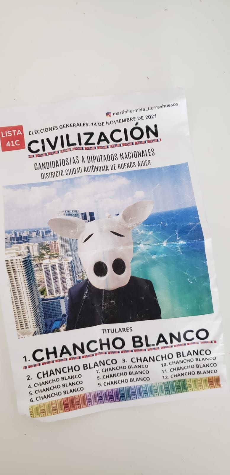 "Soy el chancho blanco", sentencia para presentarse el artista performático Martín Hermida. Cuenta que empezó su campaña hace 4 meses, que su partido se llama "Civilización" -en referencia a la clásica distinción de Domingo Faustino Sarmiento entre civilización y barbarie- y que toma como lema muchas de las cosas que proponen los liberales.