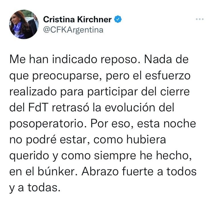 Debido a su operación, la vicepresidenta Cristina Fernández de Kirchner no va a estar asistiendo al evento del Frente de Todos, ya que sus médicos le recomiendan reposo.