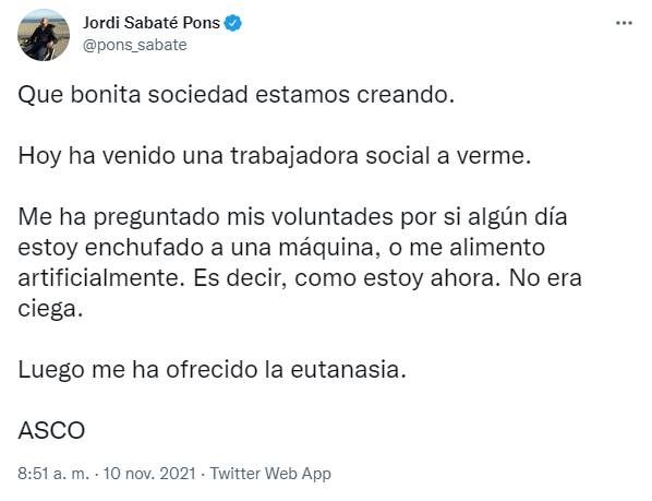 En la misma tónica, explicaba: "Tengo ELA, enfermedad mortal. Elegí seguir viviendo. El coste de mi elección me cuesta más de 6.000€ al mes. Pago 4 nóminas. 4 auxiliares de enfermería para que me mantengan vivo en mi domicilio. Elegir morir es 'gratis'. Elegir vivir tiene un precio. Es terrorífico".