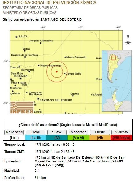 Según informó el Instituto Nacional de Prevención Sísmica, el temblor fue a las 18:38 horas. Tuvo una magnitud de 5.4 grados en escala sismológica de Richter y una profundidad de 614 kilómetros.