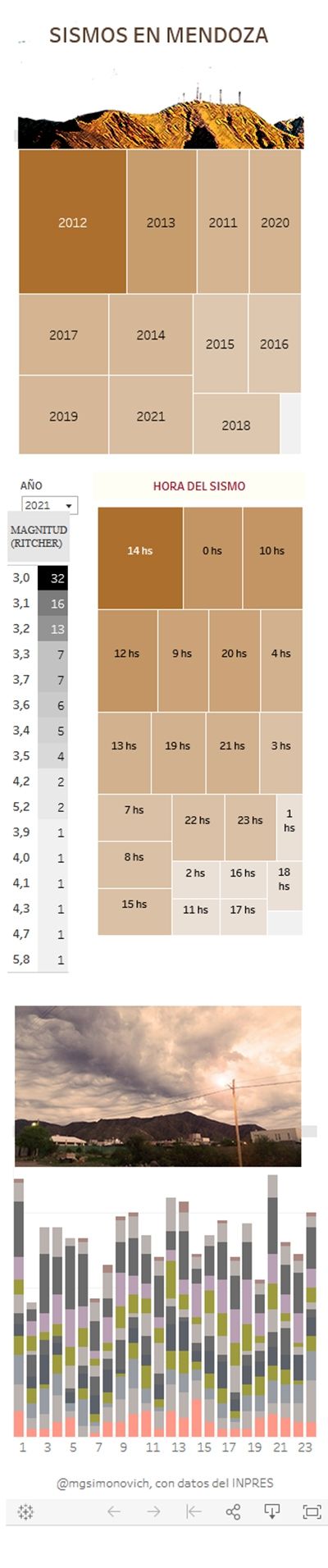 Hasta el momento, el 2012 ha sido el año con más temblores en Mendoza (de magnitud 3 en adelante) y las franjas horarias donde más se mueve el piso son de 9 a 10, de 13 a 14, las 20 y las 0 horas. En lo que respecta al 2021, la hora con más sismos ha sido las 14 (con 10 en total) y le siguen las 0 horas y las 12 horas (ambas con 7, respectivamente), según datos del INPRES. Mirá los detalles el informe interactivo haciendo clic en la siguiente imagen: