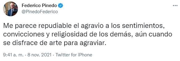 También Federico Pinedo se manifestó al respecto. "Me parece repudiable el agravio a sentimientos y convicciones religiosas de los demás, aún cuando se disfrace de arte para agraviar", sentenció y añadió: "Repudio el agravio a los sentimientos y convicciones cristianas en ArteBA".