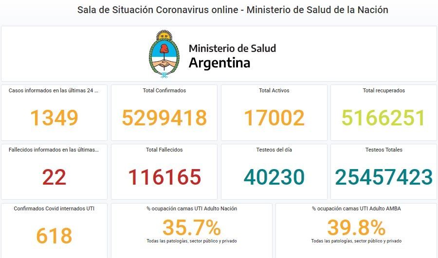 El Ministerio de Salud de la Nación informó este martes 1.349 nuevos casos positivos de coronavirus y 22 fallecidos. Con estos datos, el total de contagios asciende a 5.299.418 y las víctimas fatales ya son 116.165.