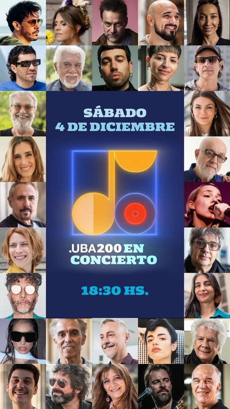 El evento gratuito será el principal de los festejos que se vienen realizando a lo largo del año, dentro del marco del bicentenario de una de las mejores universidades del continente. Se llevará a cabo el próximo sábado, 4 de diciembre a las 18:30hs, en las escalinatas de la Facultad de Derecho y contará con la participación de más de 30 artistas representativos de la música popular Argentina. Dentro de los invitados se encuentran: Fito Paez, Pedro Aznar, Lisandro Aristimuño, Nahuel Pennisi, Abel Pintos, David Lebón, Zoe Gotusso, María Becerra, Cazzu, Conociendo Rusia, Juan Ingaramo, Natalie Pérez, Mora Godoy, Juan Carlos Baglietto, entre muchos otros. Cabe destacar que los mismos estarán acompañados por la Orquesta Sinfónica de “UBA200 en Concierto”, conformada por los miembros más destacados de diferentes orquestas de todo el país: Sinfónica Nacional, Filarmónica de Buenos Aires, Estable del Teatro Colón, Estable del Teatro Argentino de La Plata, así como también, algunos integrantes de la orquesta de la Universidad de Buenos Aires y del Nacional Buenos Aires.