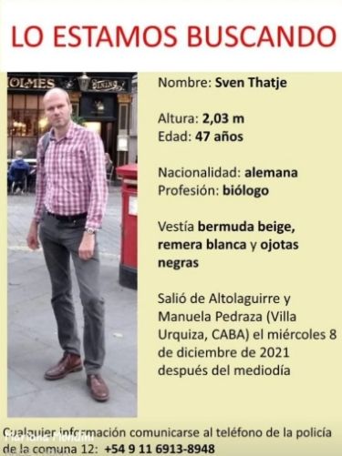 El miércoles pasado, Thatje tuvo una discusión con la dueña del lugar donde se alojaba por "problemas domésticos". "Se enojó, se puso violento y se fue a su habitación. Al rato dijo que salía a caminar y desde entonces no se sabe nada", indicaron sus colegas.