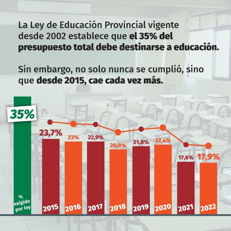 Con sucesivos informes que pueden leer en detalle (https://ciecmza.org/), desarrollados por economistas, podemos establecer la siguiente evolución del presupuesto educativo en nuestra provincia: si comparamos los $76.123 millones que la provincia invertirá en educación con los $425.552 millones de erogaciones provinciales totales, tal como lo informa la Ley de Presupuesto 2022, obtenemos que la inversión educativa representa solamente el 17,9% de los fondos que el Estado provincial pretende utilizar el año próximo. ¿Tiene presente el gobierno que la Ley de Educación Provincial vigente establece que el presupuesto educativo debe ser de un 35% del presupuesto provincial?