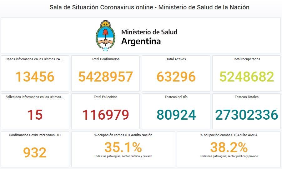 El Ministerio de Salud de la Nación informó este jueves 13.456 nuevos casos positivos de coronavirus y 15 fallecidos. Con estos datos, el total de contagios asciende a 5.428.957 y las víctimas fatales ya son 116.979.