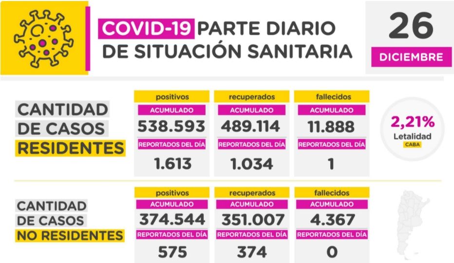 El informe del gobierno de la Ciudad Autónoma de Buenos Aires con respecto a los casos registrados en el día de ayer, 26 de diciembre, fue de 1.613 positivos; esto representa una de las jornadas con más casos de coronavirus en la Ciudad en el último rebrote.