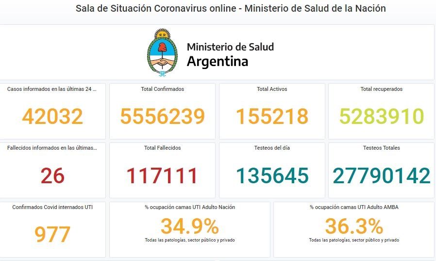 El Ministerio de Salud de la Nación informó este miércoles 42.032 nuevos casos positivos de coronavirus y 26 muertes. Con estos datos, el total de contagios asciende a 5.556.239 y las víctimas fatales ya son 117.111.