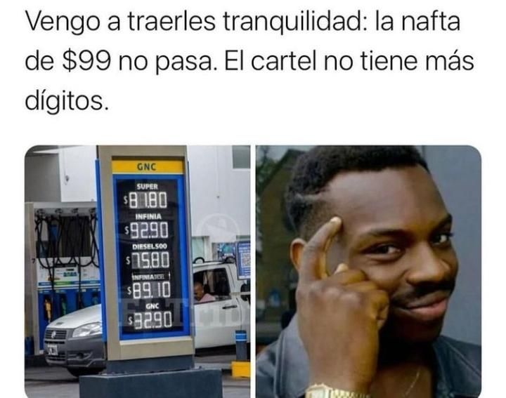En las últimas horas se difundió un ingenioso meme preguntándose si es posible que los combustibles sigan en aumento en este 2021. "Vengo a traerles tranquilidad: la nafta de $99 no pasa. El cartel no tiene más dígitos", expone la imagen humorística.
