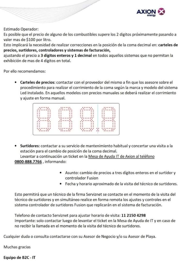 Esto, provocó la reacción de Axion, que difundió un comunicado donde expresó cómo actuará frente a esta situación. "Es posible que el precio de alguno de los combustibles supere los 2 dígitos próximamente, pasando a valer más de $100 por litro", empieza el texto. Y continúa: "Esto implicará la necesidad de realizar correcciones en la posición de la coma decimal en carteles de precio, surtidores, controladores y sistemas de facturación".