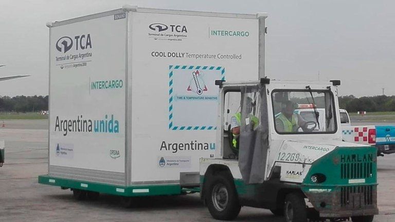 Intercargo, además, desarrolló las “dollys”. Se trata de dos heladeras gigantes que permiten trasladar vacunas a una temperatura controlada y son únicas en América Latina. Estas se utilizaron para trasladar por pista las 20 mil dosis que llegaron para Bolivia y el principio activo fabricado por el laboratorio mAbxience para la vacuna de Oxford-AstraZeneca con la que ya se habrían fabricado 12,4 millones de vacunas en el país.