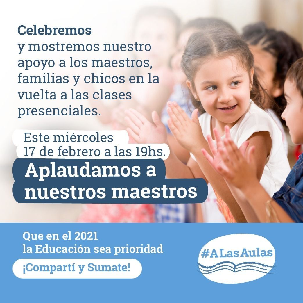 Se acerca la fecha de inicio del ciclo lectivo y aumenta la presión para que haya clases presenciales. En ese plano, un grupo de organizaciones convocaron a un reclamo a favor de la apertura de las aulas y en apoyo a los docentes. La forma de hacerlo es con un "aplauso masivo" para pedir por la educación. La iniciativa #ALasAulas reúne a unas 130 organizaciones de la sociedad civil y apunta a tomar a la educación como eje principal en 2021. Es desde allí que se convocó al aplauso como forma de hacerse sentir.
