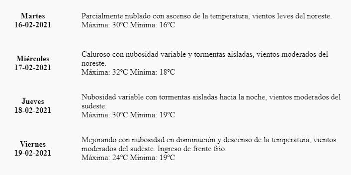"Parcialmente nublado con ascenso de la temperatura, vientos leves del noreste", dice el pronóstico.