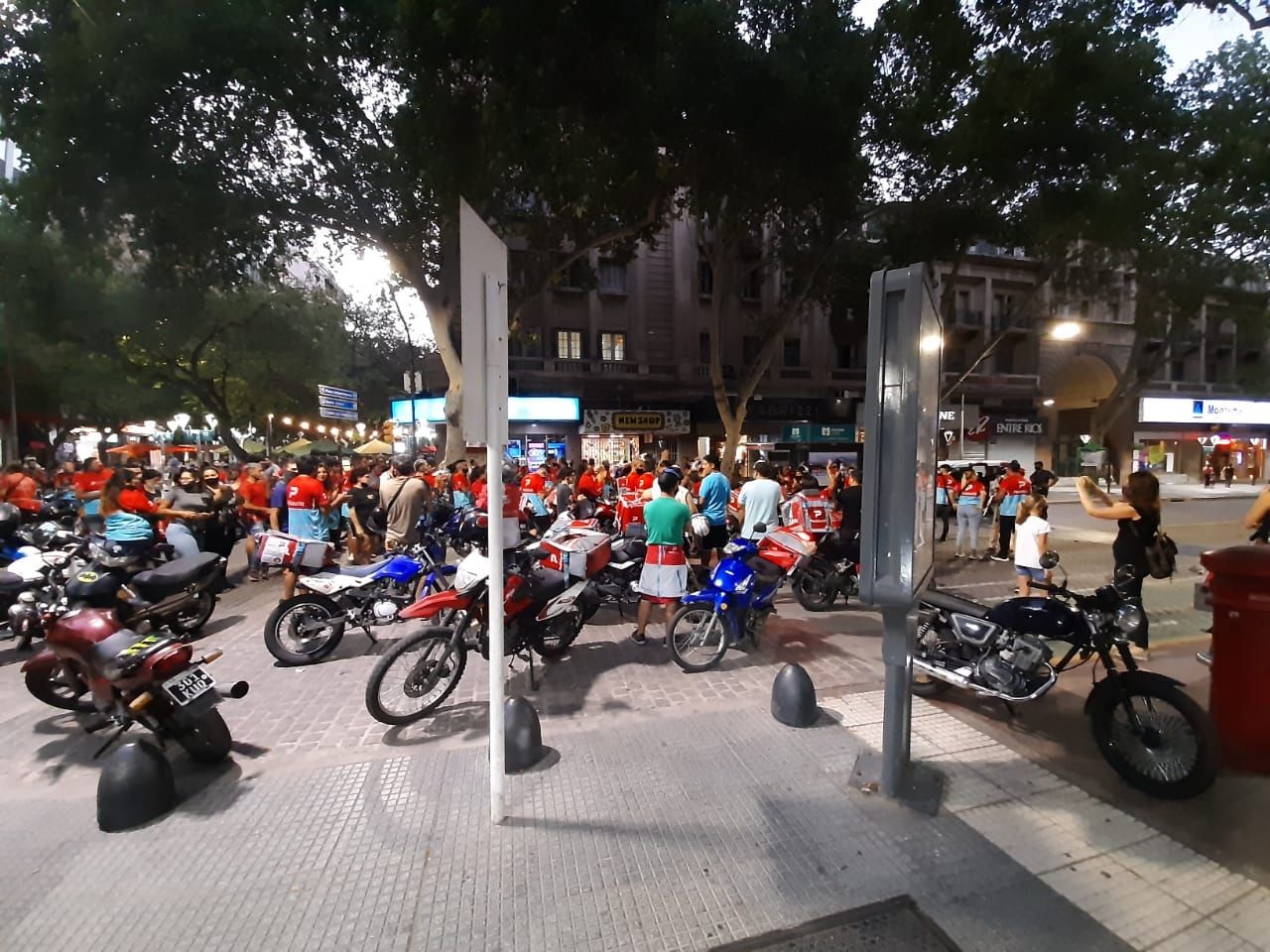 Buena parte de los 1.350 repartidores activos de Pedidos Ya en la provincia inició una manifestación esta tarde en San Martín y Peatonal Sarmiento para exigirle a la famosa aplicación de delivery que aumente a 100 pesos el pago por cada circuito de retiro y entrega de pedidos.