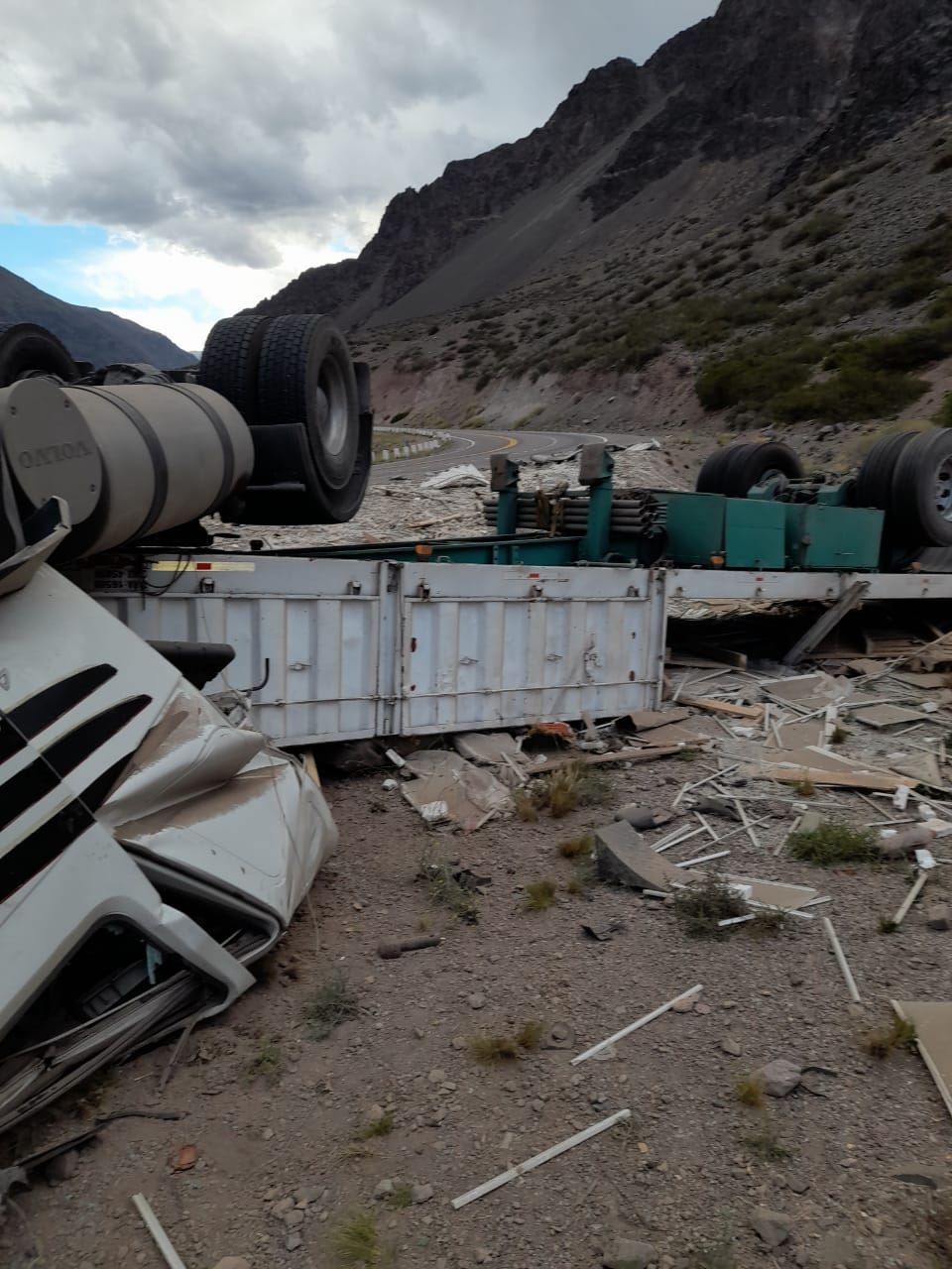 Un grave accidente se produjo en la alta montaña mendocina, a la altura de Polvaredas. Un camión volcó y su conductor quedó atrapado dentro de la cabina del vehículo.