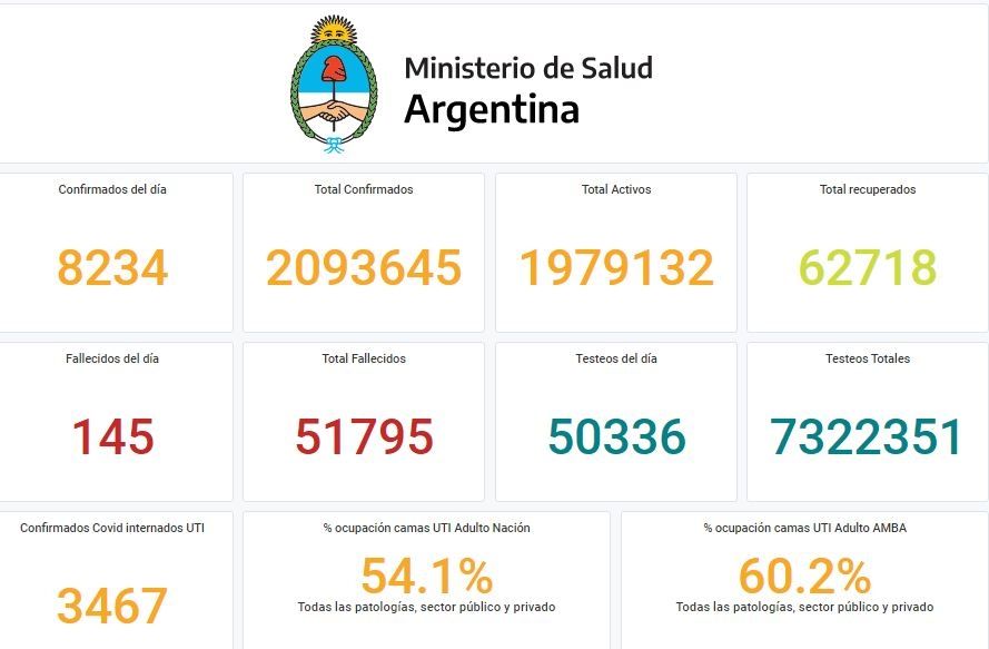 El Ministerio de Salud de la Nación informó este jueves 145 nuevas muertes por coronavirus y 8.234 nuevos contagios en las últimas 24 horas.