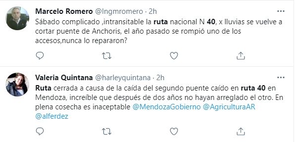 "Ruta cerrada a causa de la caída del segundo puente caído en ruta 40 en Mendoza, increíble que después de dos años no hayan arreglado el otro. En plena cosecha es inaceptable", dijo otra usuaria.