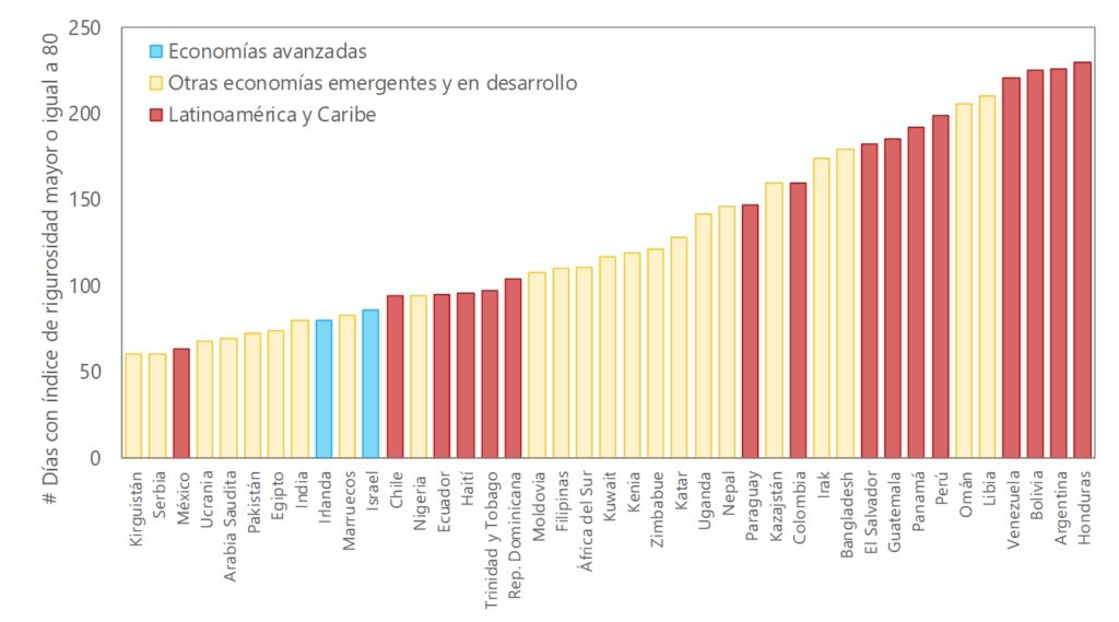 De acuerdo al informe, los países que más optaron por esta política fueron los latinos. Encabezando esta lista se encuentran Honduras, Argentina y Bolivia. "Descubrimos que los países emergentes y en desarrollo, con pocas excepciones, tuvieron los confinamientos más estrictos y prolongados", declara el BID. En este sentido " 8 de los 10 países con los confinamientos más prolongados entre marzo y octubre son latinoamericanos".