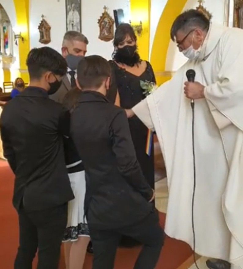 La novia ingresó a la iglesia con la marcha nupcial, y, durante el acto religioso oficiado por el cura párroco Fabián Colman, con acuerdo del obispado regional, se leyó el Evangelio, se realizó la promesa de fidelidad de los cónyuges, se rezó el Padre Nuestro y el Ave María, y comulgaron los novios y varios de los 60 feligreses presentes.