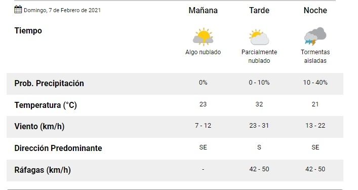 El Servicio Meteorológico Nacional pronosticó para este domingo una mínima de 20ºC y una máxima de 32ºC. El día se mantendrá algo nublado por la mañana, mientras que por la tarde el cielo tendrá una nubosidad parcial. Por la noche, en cambio, se esperan tormentas aisladas.