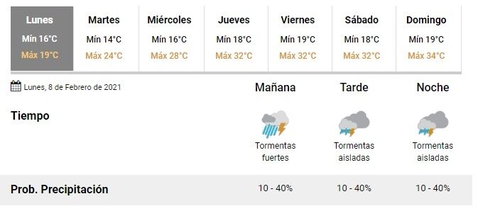 Para hoy la posibilidad de lluvias seguirá durante todo el día. La mínima fue de 16º, y la máxima será de sólo 19º. Por la mañana hay pronóstico de tormentas fuertes, mientras que el resto del día se podrían producir tormentas aisladas.