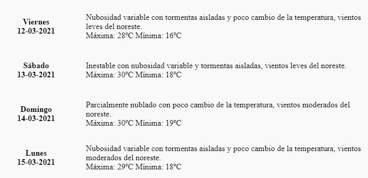 Para este viernes se espera que no haya un cambio importante respecto al jueves. "Nubosidad variable con tormentas aisladas y poco cambio de la temperatura, vientos leves del noreste", indica precisamente el pronóstico.