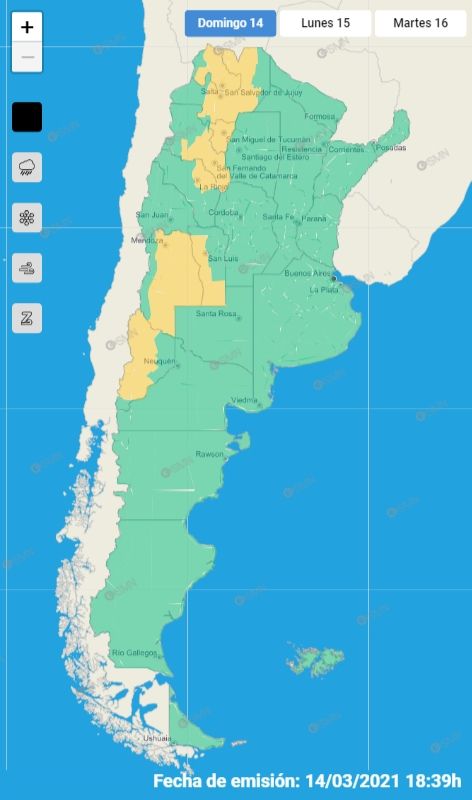 En el sistema de alertas tempranas, el SMN destacó que la provincia está en alerta amarilla, lo que indica la probabilidad de "fenómenos meteorológicos con capacidad de daño y riesgo de interrupción momentánea de actividades cotidianas".