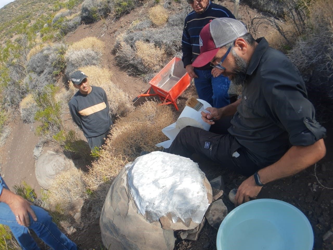 Un equipo de investigadores de la Dirección de Patrimonio Cultural realizó el rescate de fósiles de un reptil marino del grupo de los ictiosaurios compuesto por una serie articulada de vértebras, arcos neurales y costillas.