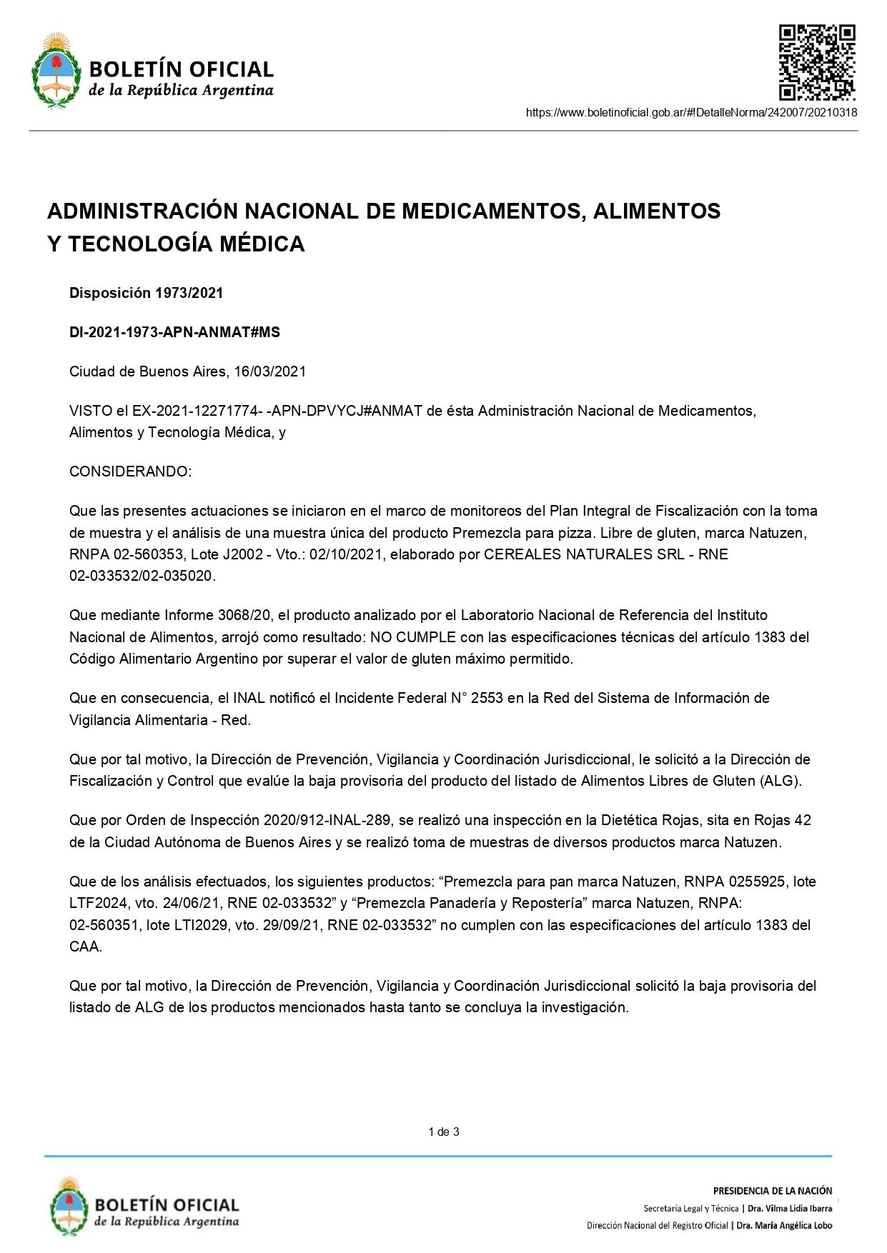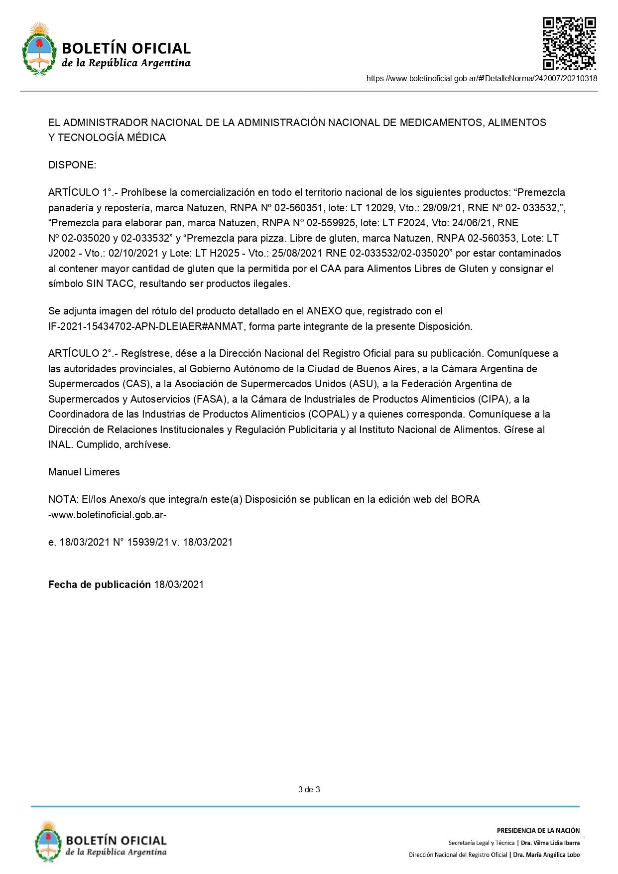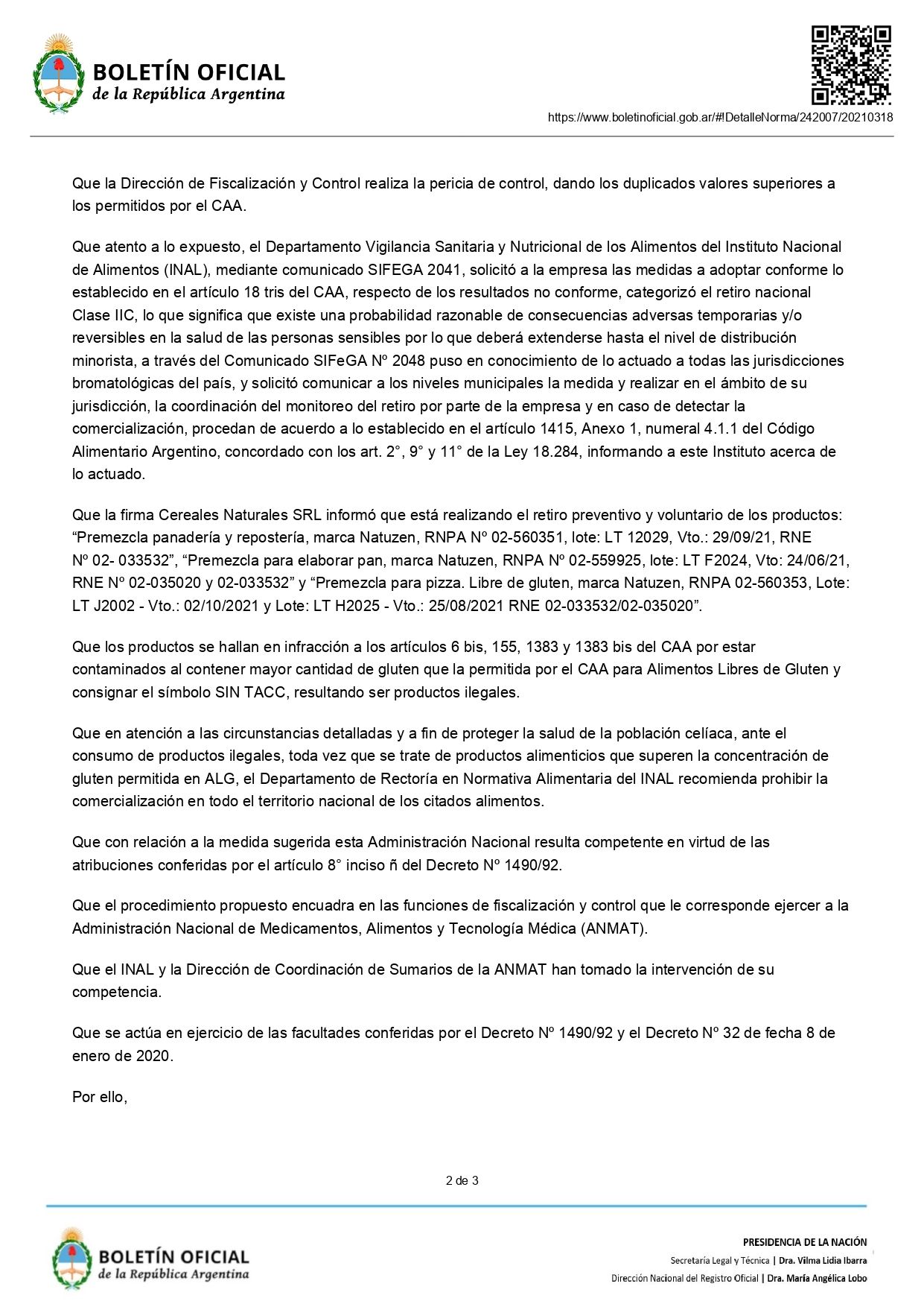 "Que mediante Informe 3068/20, el producto analizado por el Laboratorio Nacional de Referencia del Instituto Nacional de Alimentos, arrojó como resultado: no cumple con las especificaciones técnicas del artículo 1383 del Código Alimentario Argentino por superar el valor de gluten máximo permitido", informa el texto publicado en el Boletín Oficial.