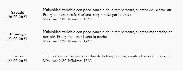 "Nubosidad variable con poco cambio de la temperatura, vientos del sector sur. Precipitaciones en la mañana, mejorando por la tarde", indica el pronóstico.