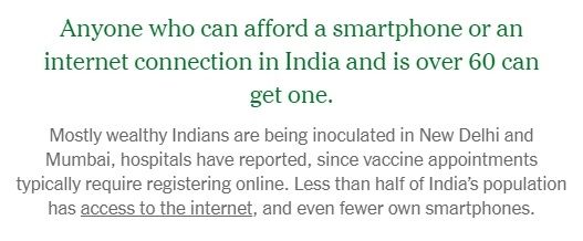 En tanto, cualquier persona que tiene el poder adquisitivo para comprar un teléfono celular o tener internet puede ser vacunado en India. "Mayormente son los indios pudientes lo que están siendo inoculados en Nueva Delhi", indica el informe. Esto se debe a que "los turnos de las vacunas se otorgan online", y "menos de la mitad de la población de India tiene acceso a internet".