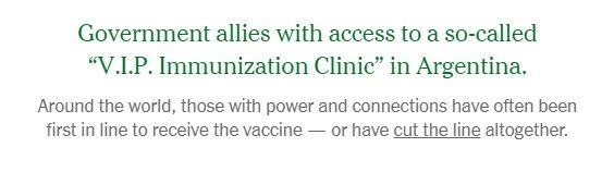 Es en esta sección en la que aparece nuestro país: "Aliados del gobierno con acceso al llamado 'vacunatorio VIP' en Argentina". Si bien el escándalo se terminó con la renuncia del exministro de Salud Ginés González García, desde el exterior sigue siendo motivo de vergüenza.