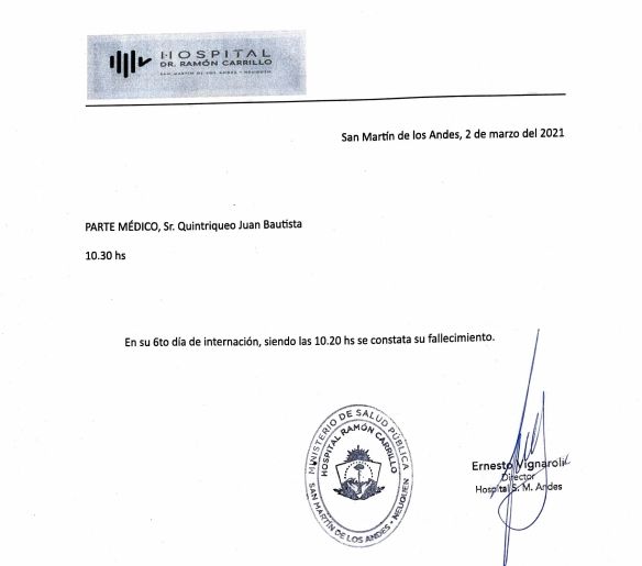 "En su sexto día de internación, siendo las 10.20 se constata su fallecimiento", indica el parte médico firmado por Ernesto Vignaroli, director del hospital de alta complejidad de San Martín de los Andes a donde fue trasladado el femicida.
