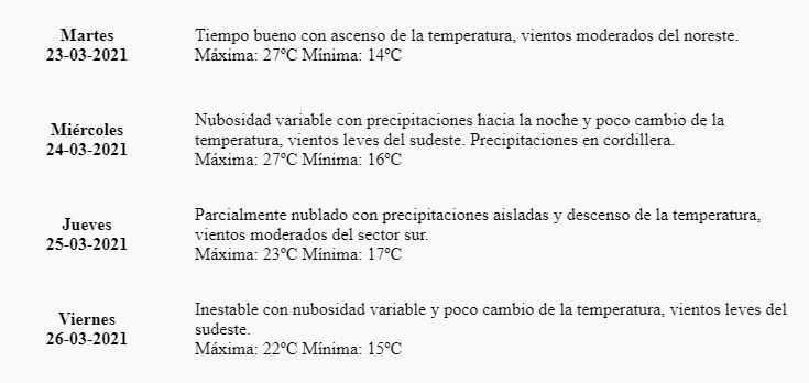 "Tiempo bueno con ascenso de la temperatura, vientos moderados del noreste", indica el pronóstico.