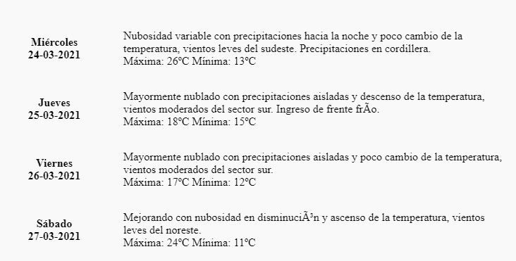 "Nubosidad variable con precipitaciones hacia la noche y poco cambio de la temperatura, vientos leves del sudeste. Precipitaciones en cordillera", indica el pronóstico.
