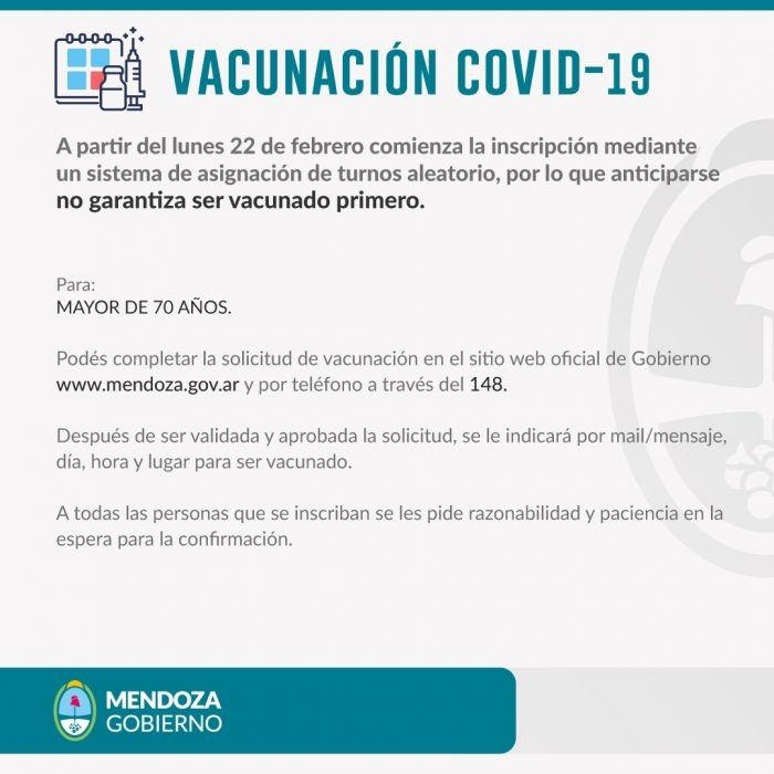 Para ser vacunadas, las personas mayores de 70 años deberán completar la solicitud ingresando al sitio oficial de Gobierno www.mendoza.gov.ar y por teléfono a través del 148. Después de ser validada y aprobada, se le indicará por correo electrónico o mensaje día, hora y lugar para ser vacunado.